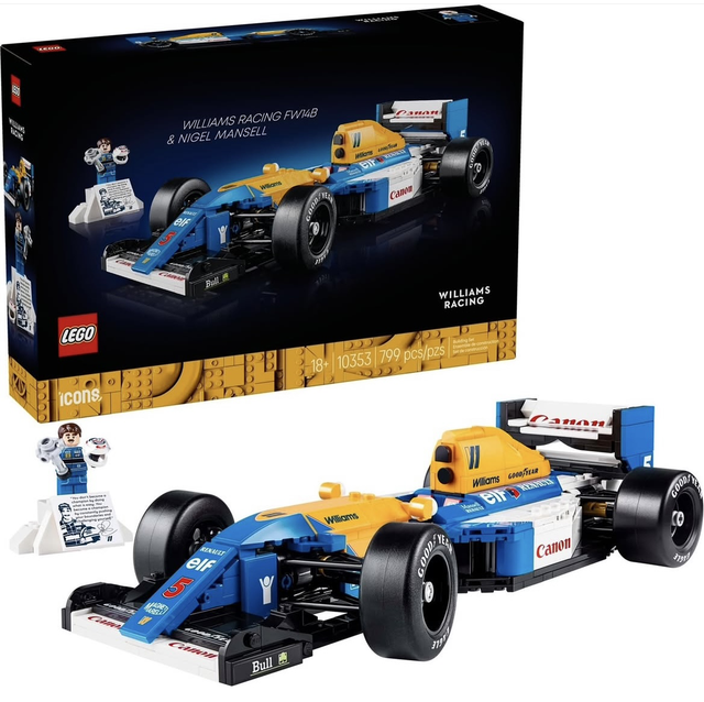 La Williams FW14B LEGO Icons è dotata di sterzo funzionante, larghi pneumatici slick posteriori con scritta Goodyear stampata e motore dettagliato, oltre a un espositore con dettagli e statistiche della monoposto. La minifigure di Nigel Mansell è dotata di casco e un espositore in stile podio con una foto e citazione del leggendario pilota.